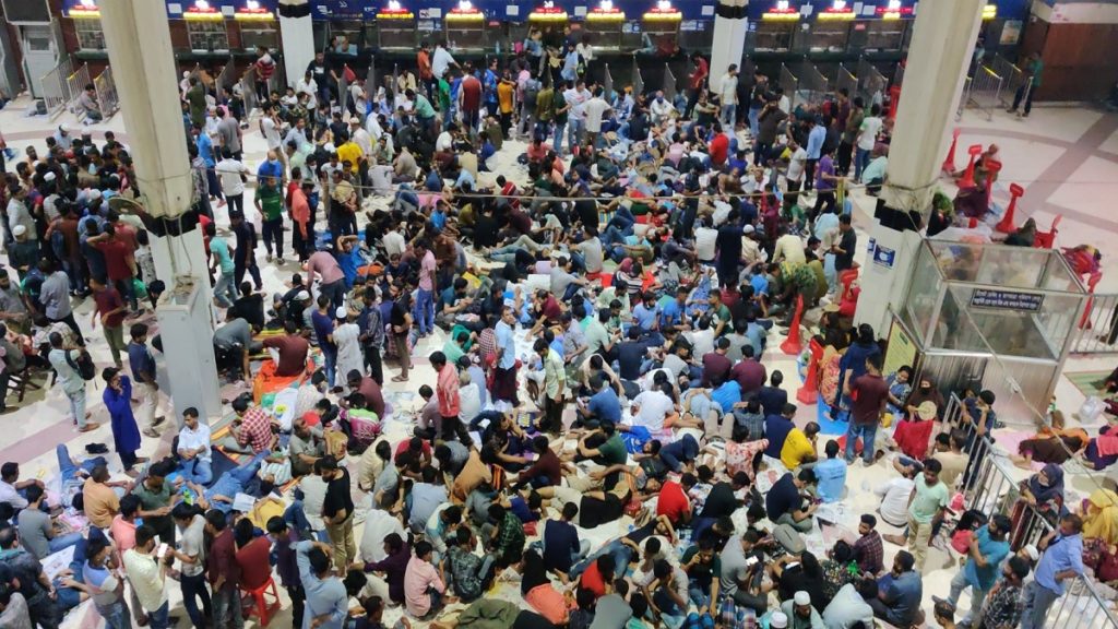 ৭ জুলাইয়ের ট্রেনের আগাম টিকিট পেতে একদিন আগেই কমলাপুর রেলস্টেশনে জড়ো হন অনেকে। কেউ কেউ লাইনে দাঁড়িয়েছেন শনিবার দুপুর থেকে। বিকেল থেকে বাড়তে থাকে টিকিটপ্রত্যাশীদের চাপ।