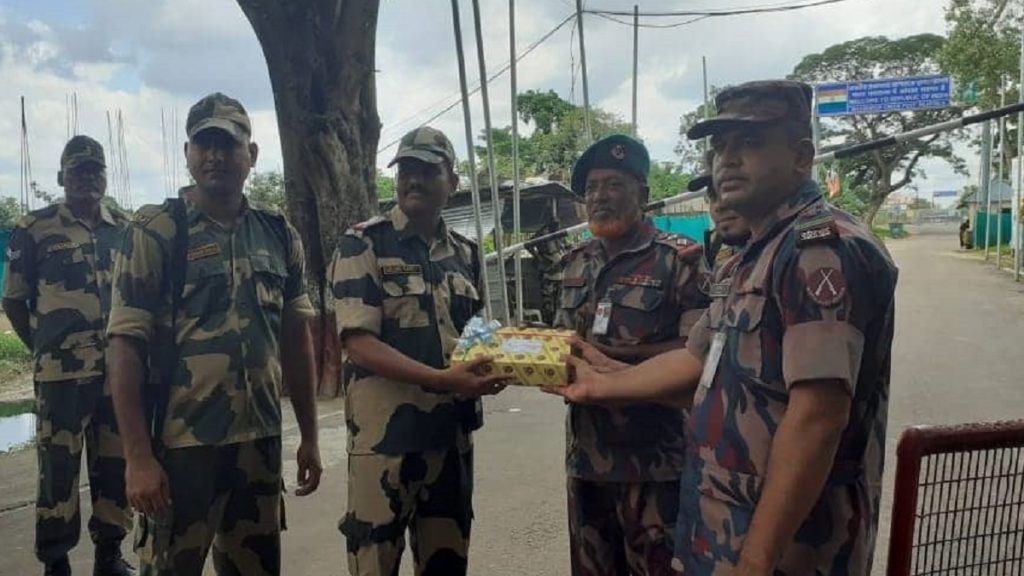 শনিবার (৯ জুলাই) বেলা সাড়ে ১১টার দিকে আখাউড়া ইমিগ্রেশন চেকপোস্ট সীমান্তের ‘নো ম্যানস ল্যান্ডে’ বিজিবি ৬০ ব্যাটালিয়নের আখাউড়া কোম্পানি সদর ক্যাম্প কমান্ডার সুবেদার নুরুল হুদা ত্রিপুরা রাজ্যের বিএসএফ ১২০ ব্যাটালিয়নের আগরতলা আইসিপি ক্যাম্প কমান্ডার শ্রীকান্তের হাতে উপহার হিসেবে মিষ্টান্ন তুলে দেন। এ সময় সেখানে উপস্থিত বিজিবি- বিএসএফ জওয়ানরা ইদের শুভেচ্ছা বিনিময় করেন।