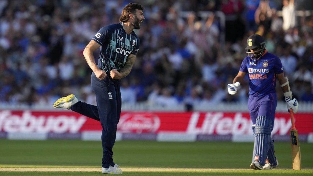 জবাবে ব্যাট করতে নেমে শুরু থেকেই রিস টপলির পেসে নাকাল হয় ভারত। শূন্য রানে ফেরেন অধিনায়ক রোহিত শর্মা। এরপর শিখর ধাওয়ান, রিশাভ পান্ত আর কোহলি দ্রুত ফিরলে ৩১ রানেই ৪ উইকেট হারিয়ে চাপে পড়ে ভারত। এরপর আর ঘুরে দাড়াতে পারেনি অতিথিরা। টপলির ৬ উইকেট নেবার ম্যাচে ১৪৬ রানে অলআউট হয় ভারত।