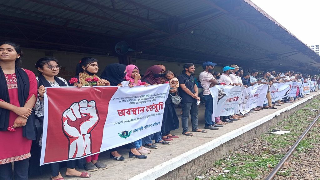 বাংলাদেশ রেলওয়ের অব্যবস্থাপনা রোধে ঢাকা বিশ্ববিদ্যালয়ের ছাত্র মহিউদ্দিন রনির উত্থাপিত ৬ দফা বাস্তবায়ন ও নোয়াখালী-ঢাকা রুটে রেলওয়ের সেবার মান বৃদ্ধিসহ ১১ দফা দাবিতে নোয়াখালীতে অবস্থান কর্মসূচি পালন করছে স্বেচ্ছাসেবীরা।