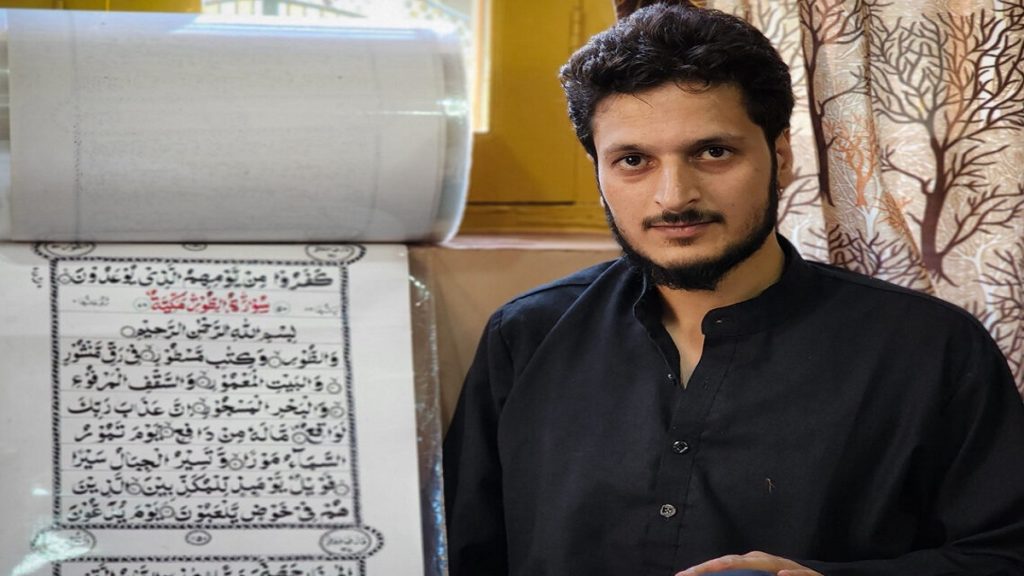 মুসলিমদের পবিত্র ধর্মগ্রন্থ আল কোরআন হাতে লিখেছেন ভারত নিয়ন্ত্রিত জম্মু কাশ্মিরের এক তরুণ। এছাড়া, লেখার চারপাশে নকশাও হাতে এঁকেছেন তিনি। হুবহু ছাপা অক্ষরের মতো দেখতে তার লেখা এ কোরআন এরইমধ্যে নজর কেড়েছে স্থানীয়দের। ৫’শ মিটার লম্বা কাগজে, পুরো ৩০ পারার কোরআন লেখার এ কাজে সময় লেগেছে দীর্ঘ ৬ মাস। খবর দ্য কাশ্মির মনিটরের।