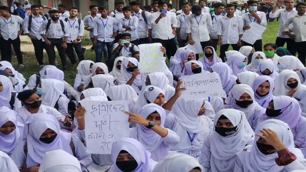 কুমিল্লার বুড়িচং উপজেলার নিমসার জুনাব আলী কলেজের অধ্যক্ষের বিরুদ্ধে এক ছাত্রীকে যৌন হয়রানি করার অভিযোগ উঠেছে। এই অভিযোগে অধ্যক্ষের পদত্যাগের দাবিতে বৃহস্পতিবার (১১ আগস্ট) সকাল ১০টা থেকে ক্লাস-পরীক্ষা বর্জন করে কলেজ প্রাঙ্গণে বিক্ষোভ করেছে শিক্ষার্থীরা।