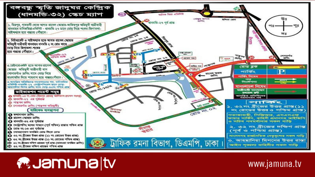 বিজ্ঞপ্তিতে জানানো হয়, অনুষ্ঠানে আগত অতিথিদের যানবাহন সুষ্ঠুভাবে চলাচল ও যানজট পরিহারের লক্ষ্যে ধানমন্ডি-৩২, জাতির জনক বঙ্গবন্ধু শেখ মুজিবুর রহমান স্মৃতি জাদুঘর এলাকায় চলাচলরত গাড়িচালক/ব্যবহারকারীদের ১৫ আগস্ট ভোর থেকে অনুষ্ঠান শেষ না হওয়া পর্যন্ত গমনাগমনের জন্য নিম্নোক্ত পথ অনুসরণের অনুরোধ করা হলো: