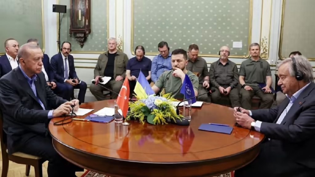 ইউক্রেন সফরে আছেন জাতিসংঘ মহাসচিব অ্যান্তোনিও গুতেরেস এবং তুরস্কের প্রেসিডেন্ট রিসেপ তায়েপ এরদোগান। দেশটির বিভিন্ন যুদ্ধবিধ্বস্ত স্থান পরিদর্শন করেন তারা। এরপরই লভিভে ইউক্রেনের প্রেসিডেন্ট ভলোদিমির জেলেনস্কির সাথে হয় তৃপক্ষীয় বৈঠক।