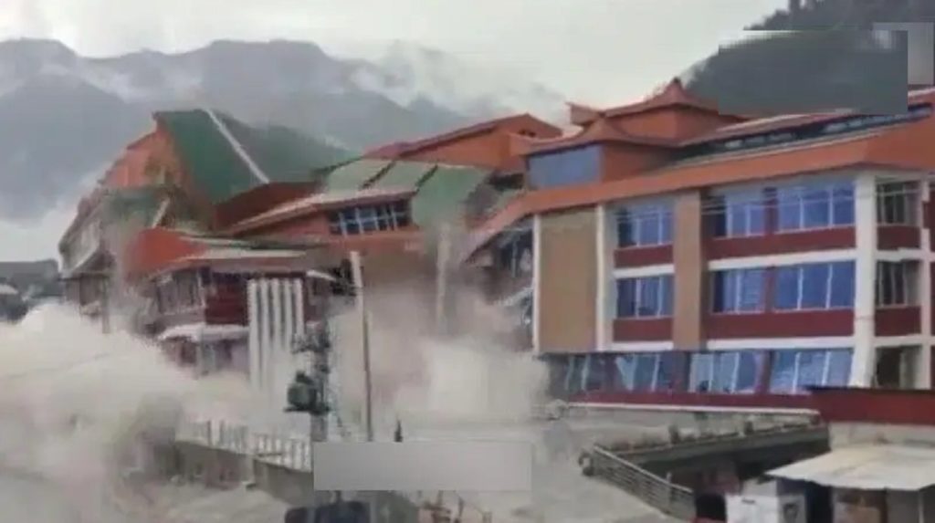 ভিডিওতে দেখা যায়, বন্যার পানির প্রচণ্ড তোড়ে হুড়মুড়িয়ে ভেঙে পড়ে ৫ তলা হোটেলটি। ভেসে যায় সাথে সাথেই।