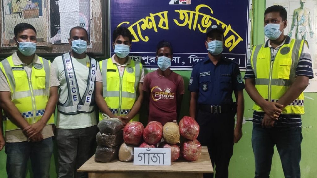 পুলিশ জানায়, শনিবার রাতে গোপন সংবাদের ভিত্তিতে বিরামপুর থানা পুলিশের একটি দল উপজেলার দক্ষিণ জগন্নাথপুর নিশিবাপুর (ভাইগড়) গ্রামে একটি অভিযান চালায়। এসময় একটি বাড়ি থেকে ৫ কেজি গাঁজা জব্দ করা হয়। এসময় ওই বাড়ির মালিক মনছুর আলী বল্টুকে (৪০) গ্রেফতার করা হয়। পরে বল্টুর (৪০) দেওয়া তথ্যের ভিত্তিতে তার প্রতিবেশী ও রুবেলের (৩৪) বাড়ি থেকেও ৫ কেজি গাঁজা জব্দ করা হয়। তবে পুলিশের উপস্থিতি টের পেয়ে রুবেল আগেই পালিয়ে যান।