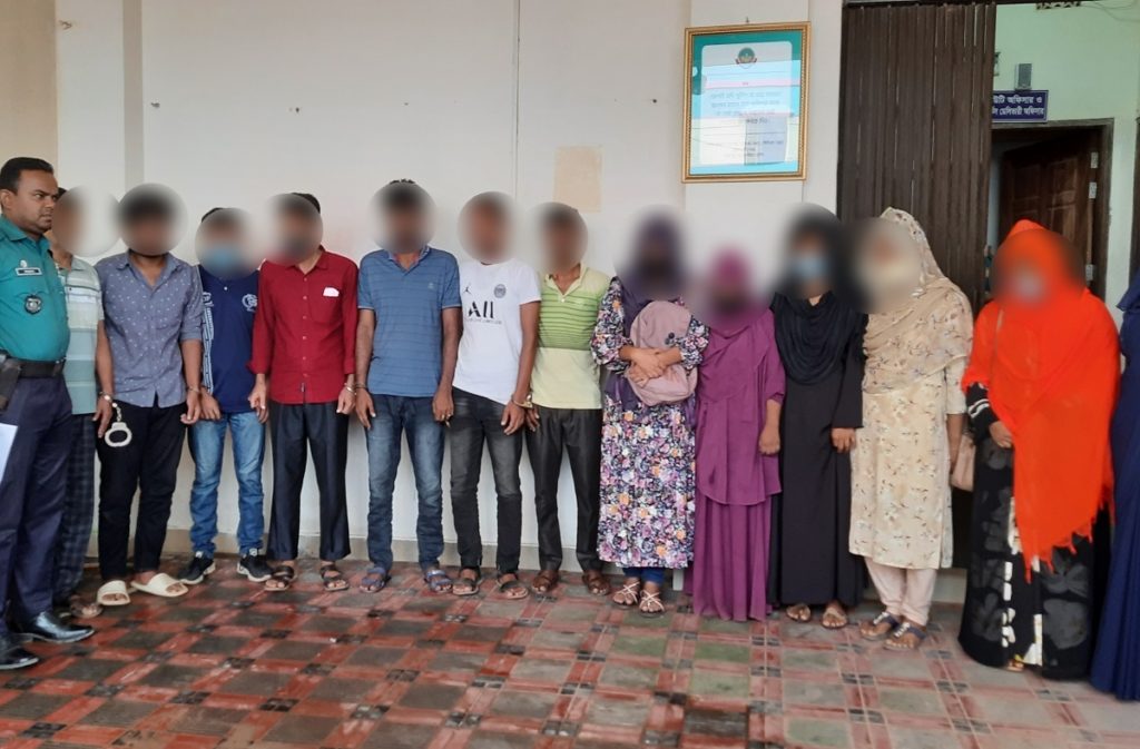 পুলিশ জানায়, গোপন সংবাদের ভিত্তিতে অভিযান চালিয়ে অসামাজিকতার সাথে জড়িত থাকার অভিযোগে তাদেরকে গ্রেফতার করা হয়। গ্রেফতারকৃতরা হলো, মো. আশরাফুল আলম (৬০), মো. মমিন মিয়া (৩৫), মো. জাহিদ হোসেন (৩৭), মো. বাবুল ইসলাম (২৪), শিপলু চক্রবর্তী (৩৫), মো. জাহিদুল ইসলাম জিহাদ (১৯), মো. খালেদ হোসেন হিমেল (২২), মোছা. জাকিয়া সুলতানা পলি (২১), মোছা. মুক্তি (২৬), মোছা. শারমিন আক্তার (২০), মোছা. মনি আক্তার (২০) এবং জান্নাতুল ফেরদৌস অহনা (১৮)।