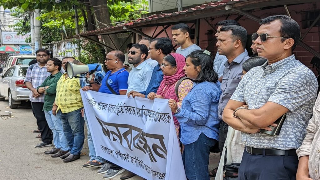 দৈনিক দেশ রূপান্তরের জ্যেষ্ঠ প্রতিবেদক বাংলাদেশ পার্লামেন্ট জার্নালিস্ট অ্যাসোসিয়েশনের (বিপিজেএ) সদস্য পাভেল হায়দার চৌধুরীর বিরুদ্ধে মানহানির মামলা প্রত্যাহারের দাবি এবং হয়রানির প্রতিবাদে এক মানববন্ধন কর্মসূচি পালন করে বিপিজেএ।