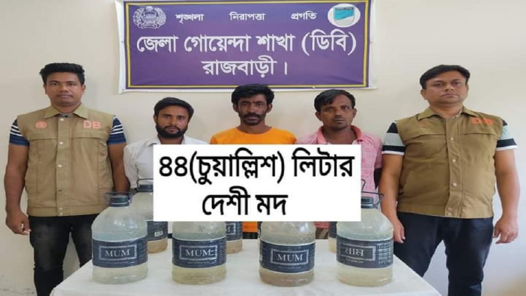 রাজবাড়ী ডিবি পুলিশের ওসি প্রাণবন্ধু চন্দ্র বিশ্বাস জানান, মঙ্গলবার দুপুর ২টার দিকে গোপন সংবাদের ভিত্তিতে এসআই জাহাঙ্গীর মাতুব্বর ও এএসআই নজরুল ইসলামসহ সঙ্গীয় ফোর্স গোয়ালন্দের বিন্দুপাড়া এলাকায় অভিযান চালায়। এ সময় পদ্মার মোড় এলাকা থেকে শহর আলী শেখ, লিটন সরদার ও কামাল খাঁকে ৪৪ লিটার দেশীয় তৈরি বাংলা মদসহ গ্রেফতার করা হয়। গ্রেফতারকৃতদের বিরুদ্ধে মামলা প্রক্রিয়াধীন রয়েছে। এছাড়া গ্রেফতার আসামি শহর আলী শেখের বিরুদ্ধে ইতোপূর্বে ২টি ও লিটন সরদারে বিরুদ্ধে ১টি মাদক মামলা বিজ্ঞ আদালতে বিচারাধীন আছে বলেও জানান তিনি।