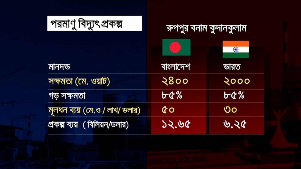 ভারতের তামিলনাড়ুতে তৈরি হচ্ছে দেশটির সবচে বড় পরমাণু বিদ্যুৎকেন্দ্র। এরইমধ্যে উৎপাদনে হাজার মেগাওয়াটের দুটি ইউনিট। ভারত সরকারের সাথে যৌথভাবে এ প্রকল্প বাস্তবায়ন করছে রোসাটম। একই কোম্পানি রূপপুরে বাস্তবায়ন করছে দেশের প্রথম পরমাণু বিদ্যুৎ প্রকল্প। রূপপুরের উৎপাদন ক্ষমতা কুদামকুলানের চেয়ে ৪শ’ মেগাওয়াট বেশি। গড় সক্ষমতা সমান হলেও প্রতি মেগাওয়াটে মূলধন ব্যয় ৫০ লাখ ডলার, যা ভারতের চেয়ে বেশি।