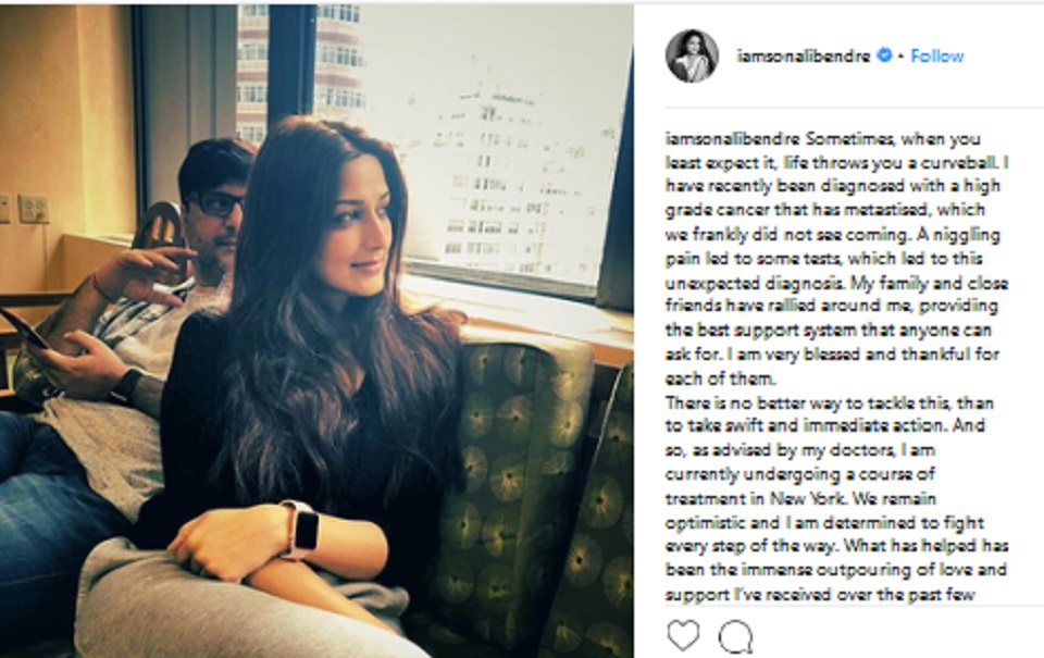 সোনালী বেন্দ্র লিখেন, “যখনই তুমি খারাপ কিছু আশা করবে না তখনই জীবন তোমাকে বাঁকা পথে নিয়ে যাবে। সম্প্রতি পরীক্ষা নিরীক্ষা আমার চূড়ান্ত পর্যায়ে ক্যান্সার ধরা পড়েছে, এবং সেটা শরীরে ছড়িয়ে পড়তে শুরু করেছে। যেটা আমি কখনওই আশা করিনি। একটা ব্যাথা হচ্ছিল। সেটা পরীক্ষা করতেই ক্যান্সার ধরা পড়ে। আমার পরিবার ও বন্ধুরা আমার পাশে আছে। আমি প্রত্যেকের কাছে কৃতজ্ঞ। এখন এটার মোকাবিলা করা ছাড়া আর উপায় নেই। চিকিৎসকরা যতটা সম্ভব দ্রুত পদক্ষেপ করার চেষ্টা করছেন। আমি বর্তমানে নিউ ইয়র্ক-এ চিকিৎসারত রয়েছি। তবে আমি আশাবাদী, এবং প্রতিটা পদক্ষেপে লড়াই করার জন্য দৃঢ় প্রতিজ্ঞ।