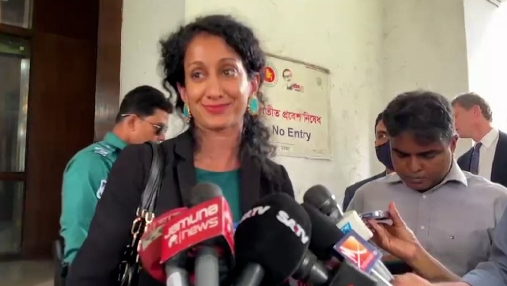 রোববার (৬ নভেম্বর) সকালে ভারপ্রাপ্ত পররাষ্ট্র সচিব খুরশীদ আলম ও আমেরিকা উইংয়ের মহাপরিচালক নাঈমউদ্দিনের সঙ্গে দ্বিপাক্ষিক ও আঞ্চলিক বিভিন্ন বিষয়ে আলোচনা করেন তিনি। এ অঞ্চলের কয়েকটি দেশ সফরের অংশ হিসেবে বাংলাদেশে যাত্রাবিরতি করছেন মার্কিন এই প্রতিনিধি। দেশটির জাতীয় নিরাপত্তা নীতি নিয়ে কাজ করেন ডেপুটি অ্যাসিস্ট্যান্ট সেক্রেটারি আফরিন আক্তার।