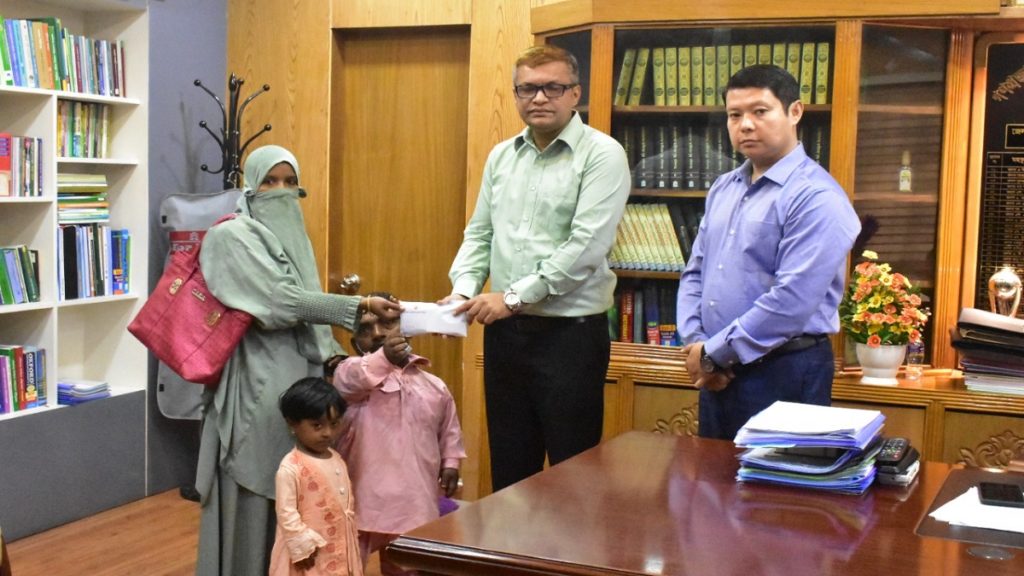 সোমবার (৭ নভেম্বর) জেলা প্রশাসক মো. শাহগীর আলম খর্বাকৃতি পরিবারের কর্তা মজিবুর রহমান ও তার পরিবারকে কার্যালয়ে ডেকে নিয়ে নগদ ১ লাখ ৬ হাজার টাকা এবং ঘর বাঁধার জন্য দুই বান টিন তুলে দেন।