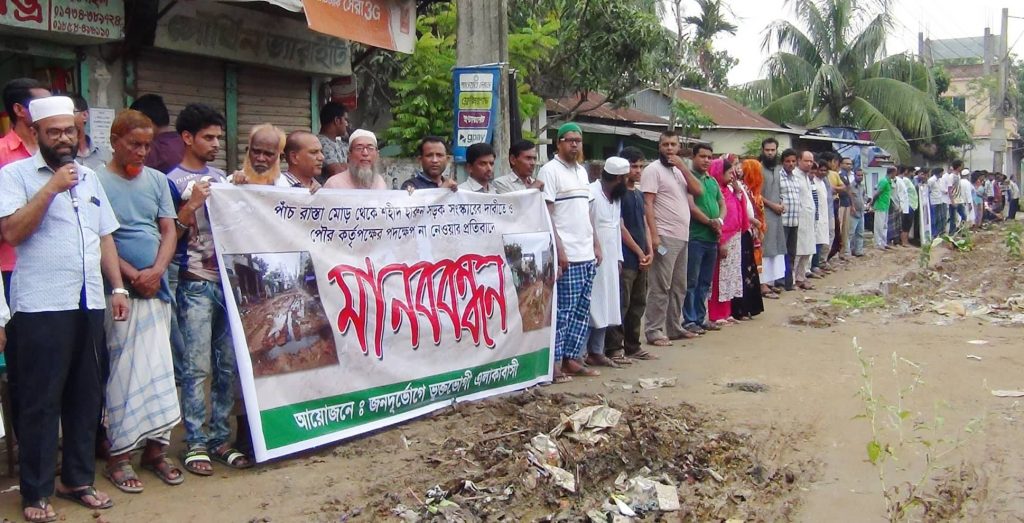 জামালপুর শহরের গুরুত্বপূর্ণ পাঁচরাস্তা-শহীদ হারুণ সড়ক সংস্কারের দাবিতে মানববন্ধন করেছে এলাকাবাসী।