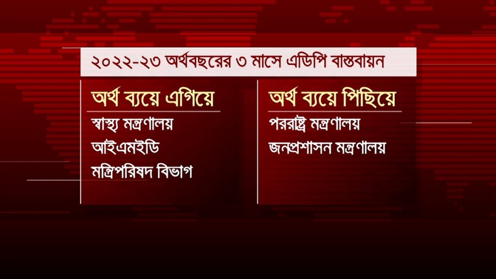 বাস্তবায়ন পরিবীক্ষণ ও মূল্যায়ন বিভাগের তথ্য অনুযায়ী, টাকার হিসেবে গত ৪ বছরের মধ্যে সর্বোচ্চ এডিপি বাস্তবায়ন হয়েছে। চলতি অর্থবছরের প্রথম ৩ মাসে সবচেয়ে এগিয়ে স্বাস্থ্য, শিক্ষা ও পরিবার কল্যাণ বিভাগ। এরপরের অবস্থানে আইএমইডি ও মন্ত্রিপরিষদ বিভাগ। অন্যদিকে, জিওবি এর এক টাকাও খরচ করতে পারেনি পররাষ্ট্র ও জনপ্রশাসন মন্ত্রণালয়।
