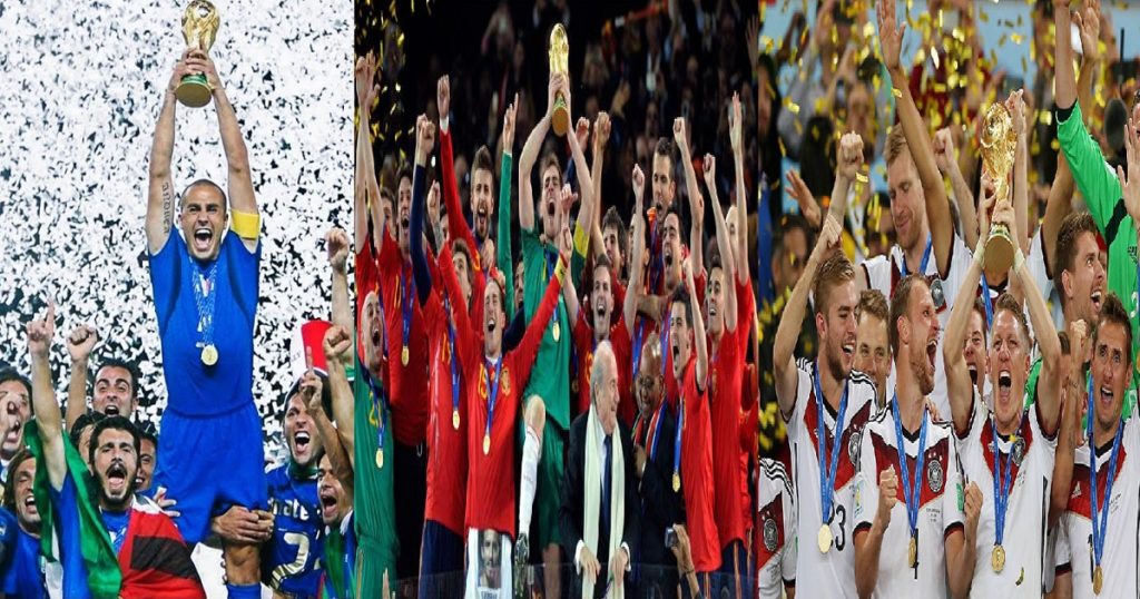 ২০০৬ সালে বিশ্ব চ্যাম্পিয়ন হয় ইতালি। শক্তিশালী দল নিয়েও ২০১০ বিশ্বকাপের প্রথম পর্ব থেকেই হেরে বিদায় নিতে হয় চ্যাম্পিয়নদের। ২০১০ সালে চ্যাম্পিয়ন হয় স্পেন। পরের বিশ্বকাপে ২০১৪ সালে গ্রুপ পর্ব থেকেই বিদায় নেয় স্পেন। ২০১৪ সালে চ্যাম্পিয়ন হয় জার্মানি। তারপরের বিশ্বকাপেই ২০১৮ সালে গ্রুপ পর্ব থেকেই বিদায় নেয় তারা।