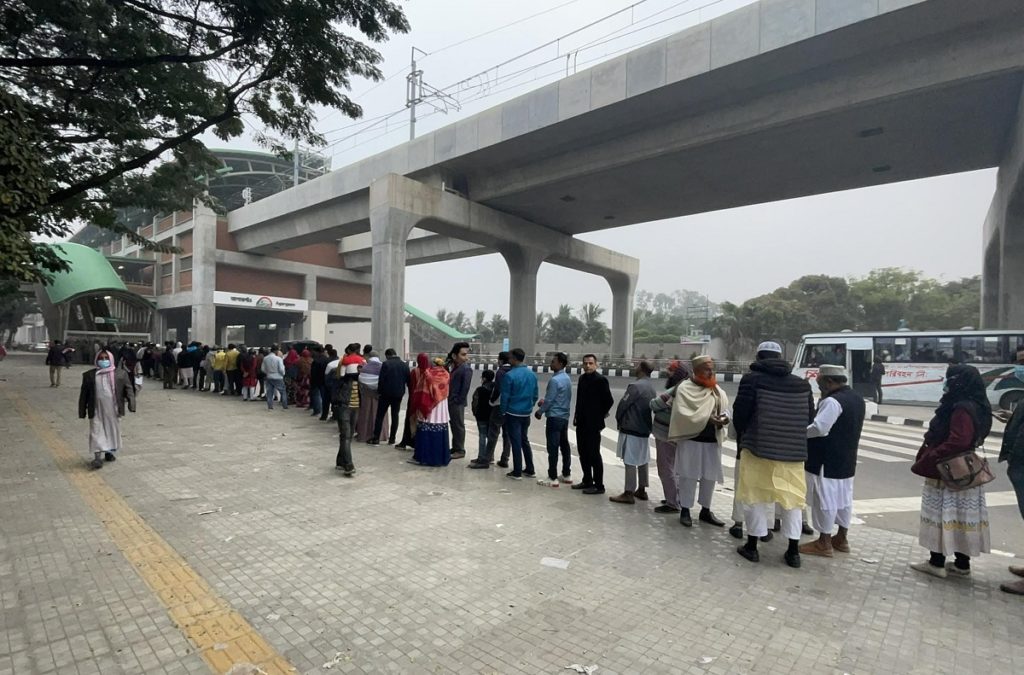 আজ ছুটির দিনে স্বপ্নের মেট্রোরেলে চড়তে ভোরের আলো ফোটার আগে থেকেই ছিল যাত্রীদের দীর্ঘ সারি। দিয়াবাড়ি ও আগারগাঁও, উভয় স্টেশনেই এমনটি দেখা গেছে।