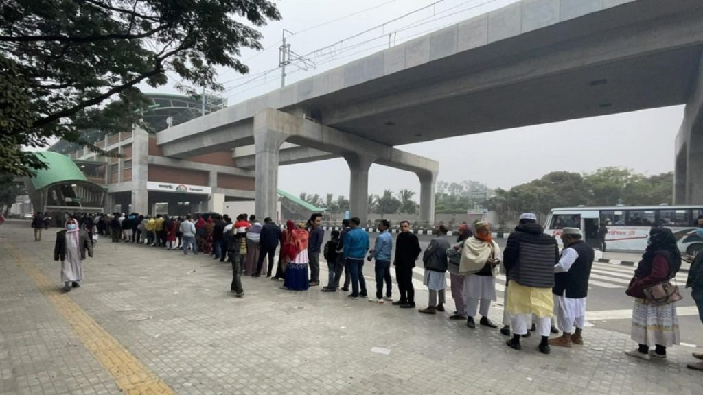 শনিবার (৩১ ডিসেম্বর) সকাল ৮টা থেকে বেলা ১২টা পর্যন্ত চলবে মেট্রোরেল। স্বপ্নের মেট্রোয় চড়তে আগারগাঁও স্টেশন থেকে পাসপোর্ট অফিস মোড় পর্যন্ত দীর্ঘ লাইনে দাঁড়িয়েছে মানুষ। জনসাধারণের জন্য বহুল প্রত্যাশিত মেট্রোরেল খুলে দেয়ার তৃতীয় দিনেও যাত্রীদের দীর্ঘ সারি তৈরি হয়েছে।