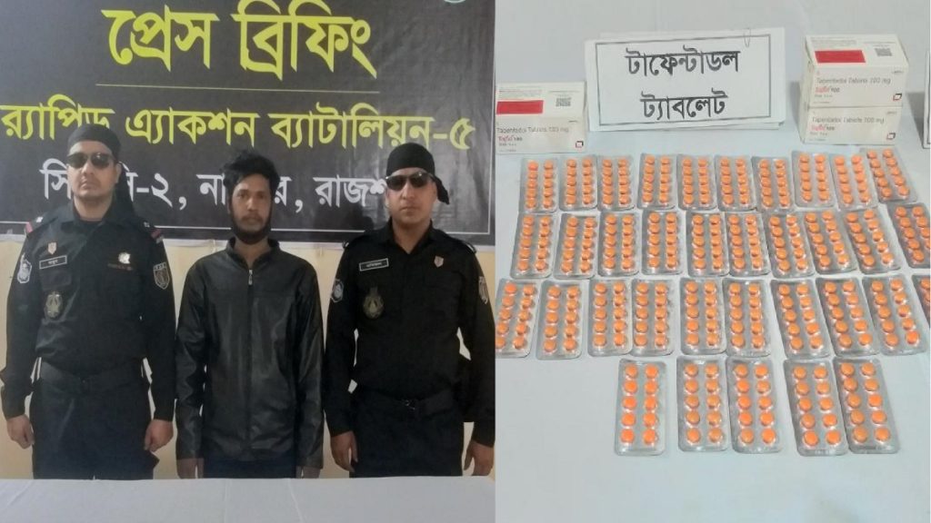 নাটোর র্যাব ক্যাম্পের ভারপ্রাপ্ত কোম্পানি অধিনায়ক রফিকুল ইসলাম জানান, সুনির্দিষ্ট গোয়েন্দা তথ্যের ভিত্তিতে রাজশাহীর একটি অপারেশন দল পশ্চিম হাগুড়িয়া এলাকায় অভিযান চালায়। এ সময় ৩৫০ পিস টাপেন্টাডল ট্যাবলেটসহ হাসানকে আটক করা হয়।