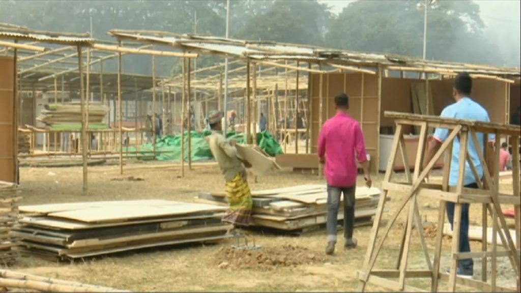 অজস্র মানুষের কর্মযজ্ঞে মুখরিত মেলা প্রাঙ্গণ। যেন দম ফেলার ফুরসত নেই। যথাসময়ে স্টল তৈরিতে বিরামহীন কাজ করছেন সংশ্লিষ্টরা।