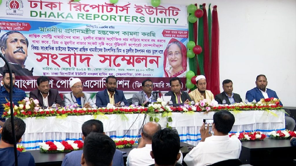 সোমবার (৬ ফেব্রুয়ারি) দুপুরে ঢাকা রিপোর্টার্স ইউনিটিতে (ডিআরইউ) আয়োজিত সংবাদ সম্মেলনে সংগঠনটির নেতারা এ অভিযোগ করেন। তারা বলেন, ১ জানুয়ারি একটি বাচ্চার দাম ছিল ৯-১০ টাকা। আর ফেব্রুয়ারির ৬ তারিখে বাচ্চা কিনতে খরচ হচ্ছে ৫৫-৬০ টাকায়। করপোরেট কোম্পানি জানে কখন প্রান্তিক খামারিরা বাচ্চা তোলে। তার ঠিক আগেই সিন্ডিকেট করে বাচ্চা ও খাবারের দামও কয়েকগুণ বাড়িয়ে দেয়। ডিম ও মুরগির উৎপাদন বাড়িয়েও ক্ষুদ্র খামারিদের ক্ষতির মুখে ফেলে দেয় করপোরেট কোম্পানিগুলো।