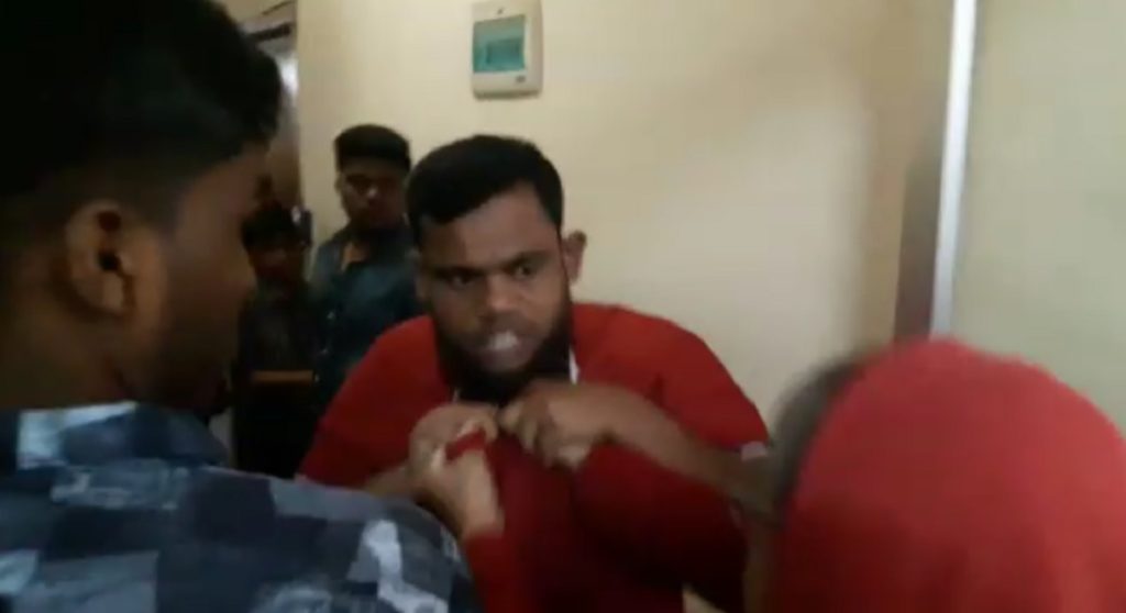 ওই নারী উচ্চস্বরে বার বার বলছেন, ‘আজ তোমাকে ছাড়বো না। আমার টাকা ফেরত দাও। আমার পাসপোর্ট লাগবে না।’ এরপর লাল রঙের টি-শার্ট পরা ওই যুবক বলছেন, ‘ছাড়েন আমাকে ছাড়েন। চলেন স্যারের কাছে যাচ্ছি। আপনার টাকা ফেরত দিচ্ছি। আমায় ছেড়ে দেন।’ এরপর পুলিশ ও আনসার সদস্যরা গিয়ে ওই যুবকের পক্ষ নিয়েছেন। পরে টাকা ফেরত নিয়েই যুবককে ছেড়েছেন ওই নারী।