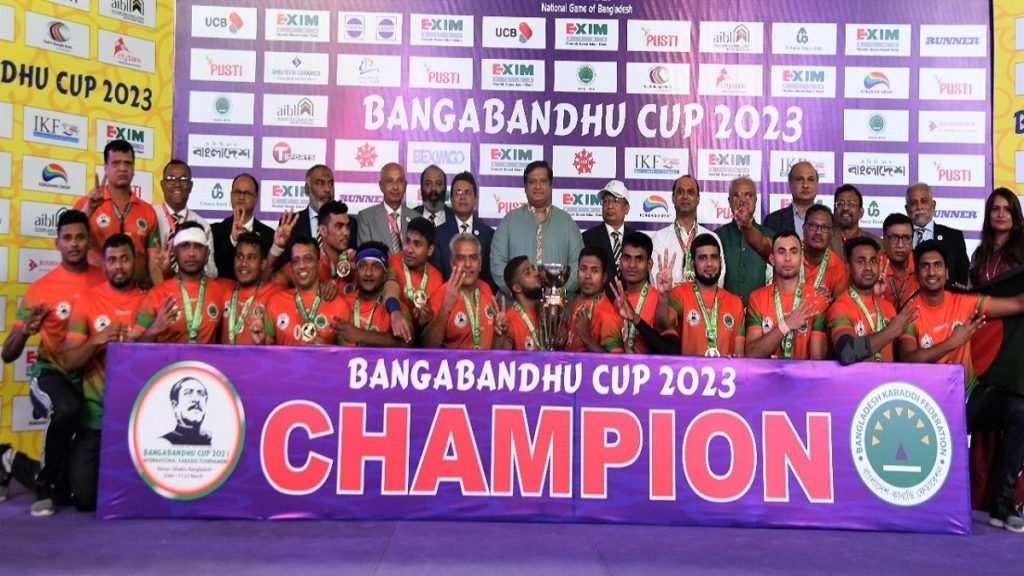 বঙ্গবন্ধু কাপ আন্তর্জাতিক কাবাডি টুর্নামেন্টে হ্যাটট্রিক চ্যাম্পিয়ন হয়েছে বাংলাদেশ, তিনবারই অপরাজিত। ফাইনালে চাইনিজ তাইপেকে ৪২-২৮ ব্যবধানে পরাজিত করে বাংলাদেশ। অথচ, শুরুতে ৭-৬ পয়েন্টে লিড পেয়েছিল তাইপে। আর, আসরে টানা সপ্তম ম্যাচ জিতে অপরাজিত থাকলো স্বাগতিকরা।