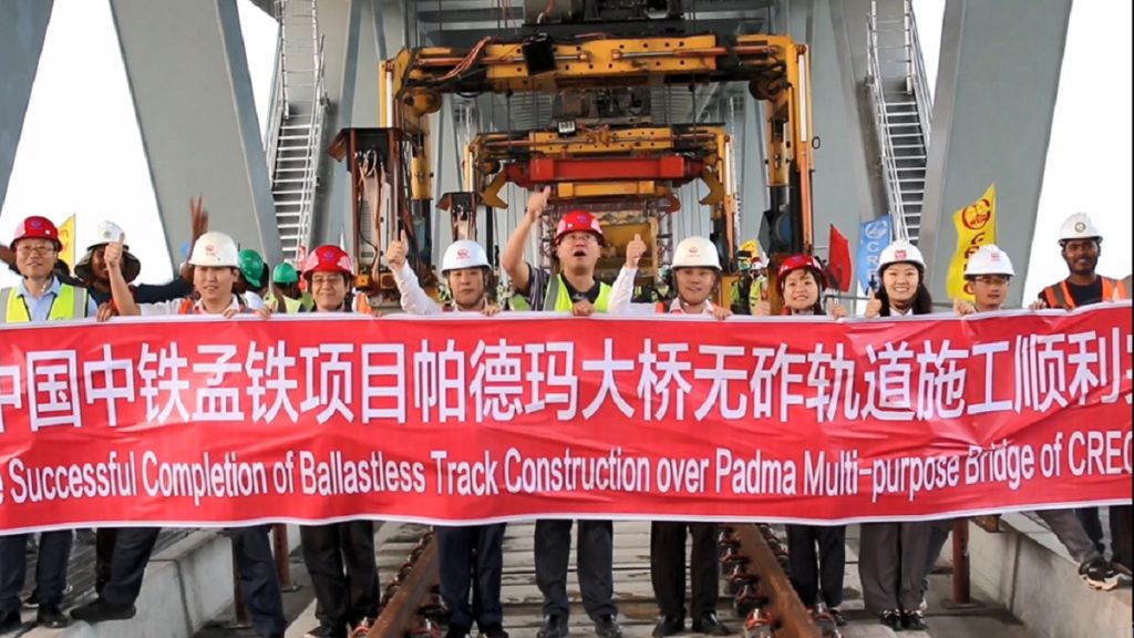 সড়কপথের পর এবার স্বপ্নের পদ্মা সেতুতে শেষ হলো রেললাইনের নির্মাণ কাজ। বুধবার (২৯ মার্চ) বিকেল সাড়ে ৫টার দিকে সেতুর মাঝামাঝি অংশের ৫নং মুভমেন্ট জয়েন্টের কাছে অবশিষ্ট ৭ মিটার অংশের ঢালাই কাজ শেষ করেন প্রকৌশলীরা। কাজ শেষ হওয়ায় রঙিন ব্যানার নিয়ে উচ্ছাস প্রকাশ করেন সেখানে কর্মরত দেশি-বিদেশি প্রকৌশলীরা।