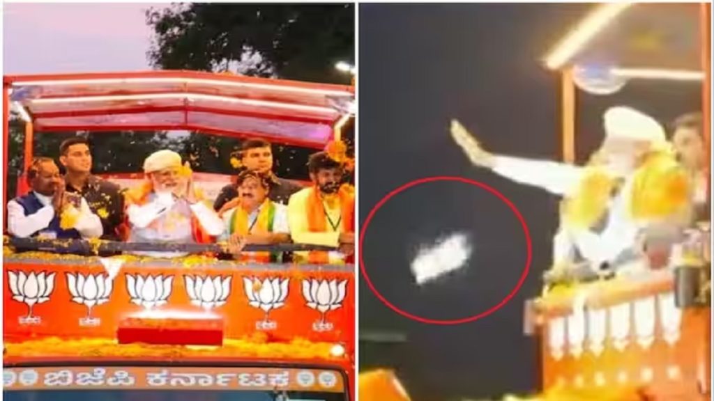 আগামী ১০ মে কর্নাটকে অনুষ্ঠিত হবে বিধানসভা নির্বাচন। জন-সংযোগের জন্য রোববার কর্নাটকে উপস্থিত হন প্রধানমন্ত্রী নরেন্দ্র মোদি। বিজেপি এমপি প্রতাপ সিমহা এবং সাবেক আইনপ্রণেতাদের নিয়ে ছাদখোলা গাড়িতে প্রচারণা চালাচ্ছিলেন তিনি। এ সময় হঠাৎ মোদিকে লক্ষ্য করে ছুটে আসে একটি মোবাইল ফোন।