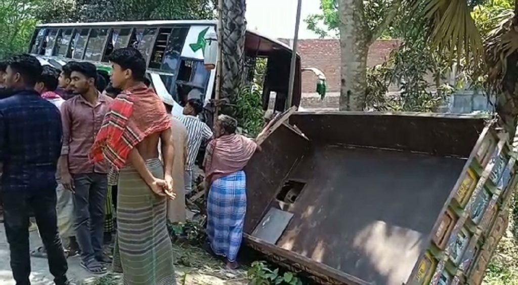 অপরদিকে বেলা পৌনে ১২টার দিকে ইট নিয়ে চিনাখড়ার দিকে ফিরতেছিলেন নছিমন চালক জুয়েল ও হেলপার সুরুজ। এ সময় কাশিনাথপুরের সাটিয়াকোলা এলাকায় পৌঁছালে ঢাকাগামী শাহজাদপুর ট্রাভেলস নামের যাত্রীবাহী বাসের সাথে নছিমনের সঙ্গে মুখোমুখি সংঘর্ষ হয়। এতে ঘটনাস্থলেই একজন মারা যান। আরেকজনকে পাবনা জেনারেল হাসপাতালে নেয়া পথে মারা যান।