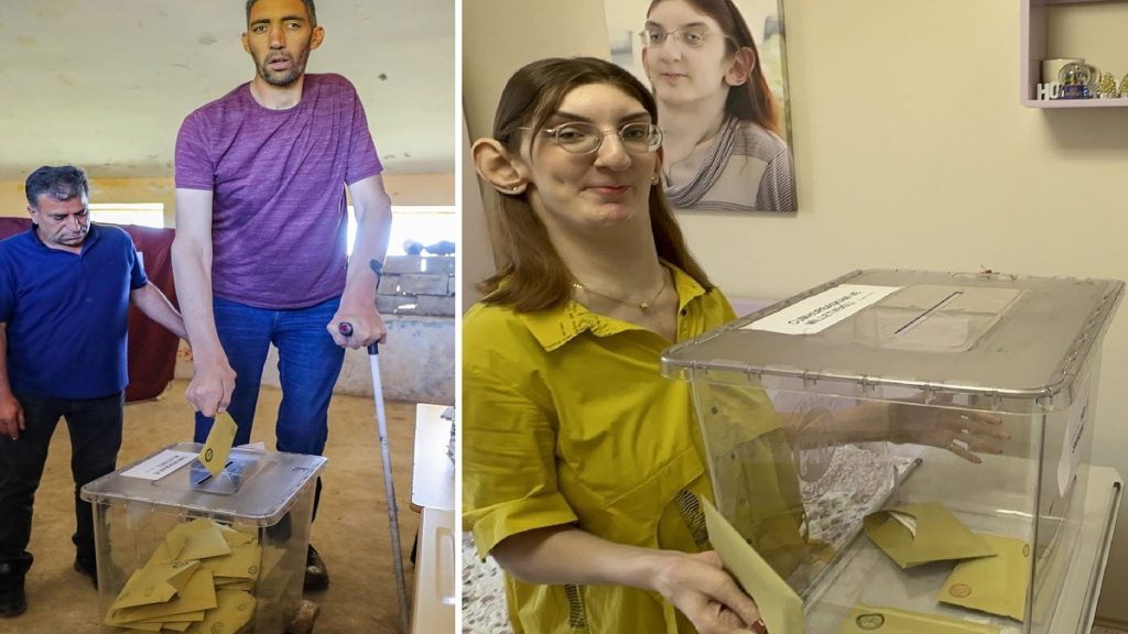 তুরস্কের সাধারণ নির্বাচনে ভোট দিয়েছেন বিশ্বের সবচেয়ে লম্বা নারী ও পুরুষ রুমেইসা গেলগি ও সুলতান কোসেন। তবে চলাফেরায় অসুবিধার কারণে বাড়ি থেকেই ভোট দেন রুমেইসা। নির্বাচন কর্মকর্তারা মোবাইল ব্যালট বক্স নিয়ে তার বাড়িতে যান। তবে কোসেন ভোটকেন্দ্রে গিয়েই ভোট দিয়েছেন। খবর ডেইলি সাবার।