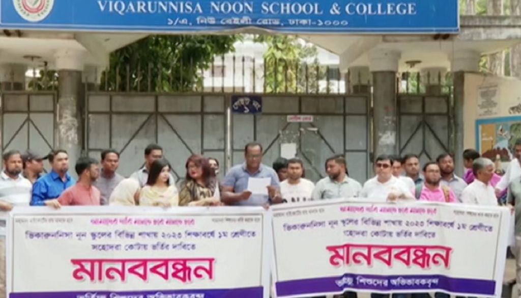 সহোদর কোটায় প্রথম শ্রেণিতে ভর্তির দাবিতে মানববন্ধন করেছেন ভিকারুননিসা নূন স্কুল ও কলেজের অভিভাবকরা।