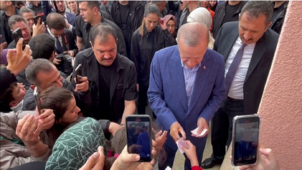 রোববার (২৮ মে) ইস্তাম্বুলের রান-অফ বা দ্বিতীয় ধাপের ভোটদানের জন্য যান তুর্কি প্রেসিডেন্ট। কেন্দ্রের বাইরে এসে উপস্থিত কর্মী-সমর্থক এবং সাধারণ ভোটারদের সাথে তিনি করেন কুশল বিনিময়। এ সময় অনেকে সালাম দিলে তাদের হাতে ধরিয়ে দেন সালামি।