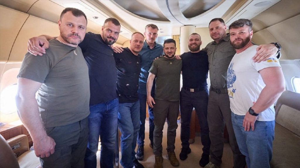রাশিয়ার বিরুদ্ধে লড়াইয়ে বন্দি হওয়া ইউক্রেনীয় আজভ কমান্ডাররা মুক্তি পেয়ে দেশে ফিরেছেন। দেশটির প্রেসিডেন্ট ভলোদিমির জেলেনস্কি তাদের সঙ্গে নিয়ে তুরস্ক থেকে ইউক্রেন ফিরেছেন। খবর সিএনএন’র।