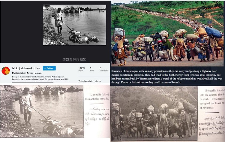বইটিতে রাখাইনের আর্কাইভ ছবি হিসেবে একটি ছবি দেয়া হয়েছে। তাতে দেখা গেছে, পানিতে ভেসে থাকা লাশ একজন ব্যক্তি উঠানোর চেষ্টা করছেন। ছবির ক্যাপশন হিসেবে লেখা হয়েছে, ‘বাঙালিরা স্থানীয় জাতিগোষ্ঠিদের নৃশংসভাবে হত্যা করেছে’।