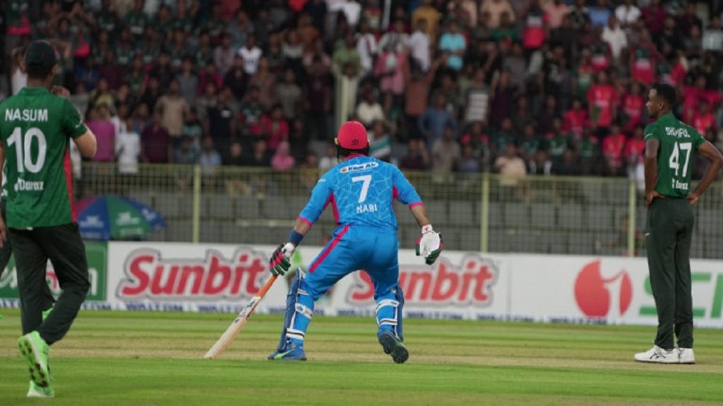 এই দু’জনে যোগ করেন ৩৫ রান। মিরাজের করা শর্ট ডেলিভারিতে ২৩ বলে ২৩ রান করা নাজিবউল্লাহ কাট করতে গিয়েছিলেন। যদিও তা ঠিক মতো হয়নি। উল্টো ব্যাটের নিচের কানা ছুঁয়ে ঊরুর সামনের অংশে লেগে বল যায় উইকেটের পেছনে লিটনের হাতে। লিটনও ঝাঁপিয়ে পড়ে দারুণ এক দৃষ্টিনন্দন ক্যাচ নেন।