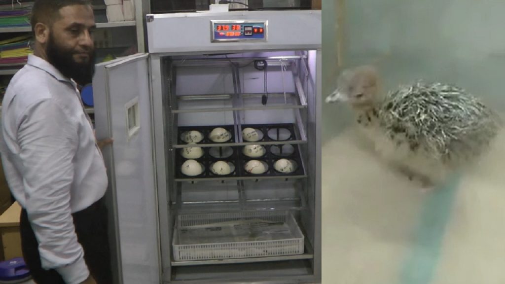 ইনকিউবেটরের মধ্যে উটপাখির ডিম ও নব্য ফোটা বাচ্চা।