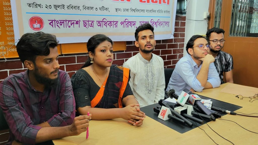 রোববার (২৩ জুলাই) বিকেলে ঢাকা বিশ্ববিদ্যালয় সাংবাদিক সমিতিতে এক সংবাদ সম্মেলনে আনুষ্ঠানিকভাবে পদত্যাগ করেন বিশ্ববিদ্যালয় শাখার ২১ নেতা। ঢাবি ছাত্র অধিকার পরিষদের সভাপতি আসিফ মাহমুদ সংবাদ সম্মেলনে পদত্যাগের ঘোষণা দেন। এ সময় সাধারণ সম্পাদক আহনাফ সাঈদ খান, যুগ্ম সাধারণ সম্পাদক নুসরাত তাবাসসুমসহ অন্যান্য নেতারা উপস্থিত ছিলেন।