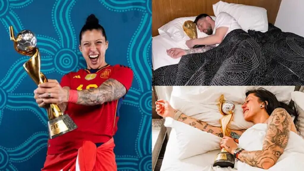 কাতার বিশ্বকাপ জয় করার পর ট্রফি নিয়ে লিওনেল মেসির ঘুমানোর আইকনিক সেই ছবি দেখার পর তা অনুসরণ করতে কার না ইচ্ছে করবে! জেনি হারমোসোও হয়তো ছিলেন সেই দলে। তাই নারী বিশ্বকাপ জয়ের পর বার্সেলোনা ও স্পেনের ইতিহাসে সর্বোচ্চ এই গোলদাতা মেসির মতোই পোজ দিয়েছেন। পরম আরাধ্য বিশ্বকাপ ট্রফি নিয়ে ঘুমানোর ছবি টুইট করে ক্যাপশনে লিখেছেন, নিখুঁত স্বপ্ন… যা সত্যি হলো। গোল ডটকমের খবর।