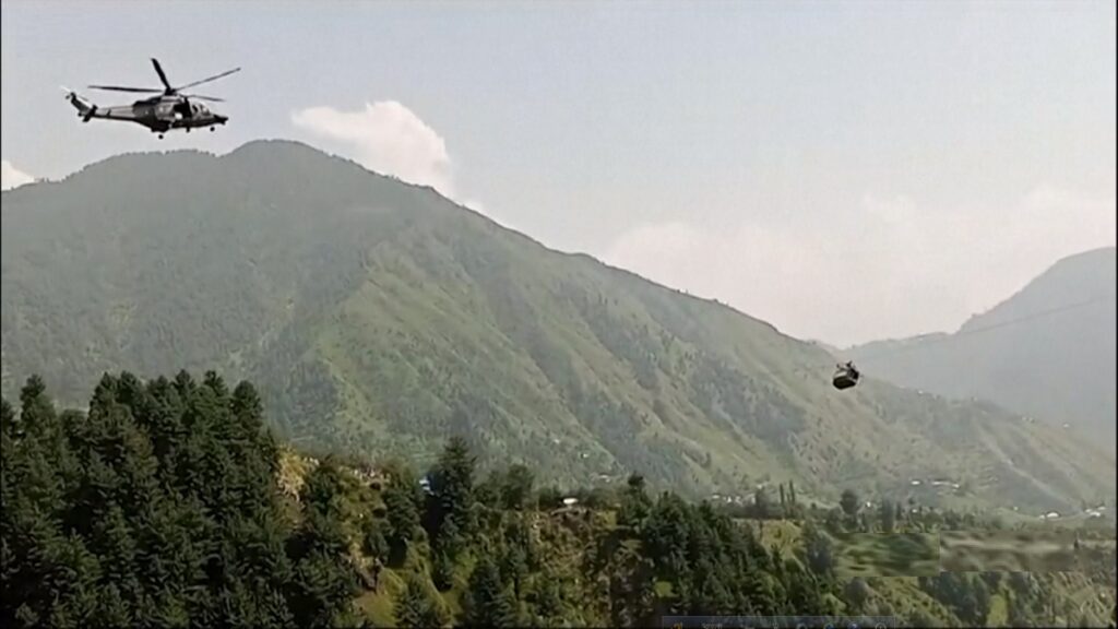 পাকিস্তানে পাখতুনখোয়ায় পাহাড়ি এলাকায় ক্যাবল কারের তার ছিঁড়ে ভূ-পৃষ্ঠ থেকে প্রায় ১২শ ফুট উঁচুতে ঝুলছে ৬ শিশুসহ আটজন। মঙ্গলবার (২২ আগস্ট) সকালে ক্যাবল কারের তার ছিঁড়ে যাওয়ায় এ ঘটনা ঘটে। সামরিক হেলিকপ্টারের মাধ্যমে উদ্ধারকাজ চলছে। শেষ খবর পাওয়া পর্যন্ত চার জন শিশুকে উদ্ধার করা হয়েছে। খবর রয়টার্সের।