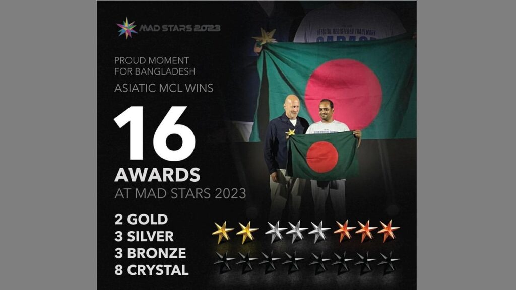 আন্তর্জাতিক বিজ্ঞাপনী উৎসব ম্যাড স্টারস ২০২৩-এ ১৬টি অ্যাওয়ার্ড জিতেছে এশিয়াটিক মার্কেটিং কমিউনিকেশনস লিমিটেড। যার মধ্যে রয়েছে ২টি গোল্ড, ৩টি সিলভার, ৩টি ব্রোঞ্জ ও ৮টি ক্রিস্টাল। গতকাল শুক্রবার (২৫ আগস্ট) অনুষ্ঠিত হয় বিজ্ঞাপনী এই উৎসব।