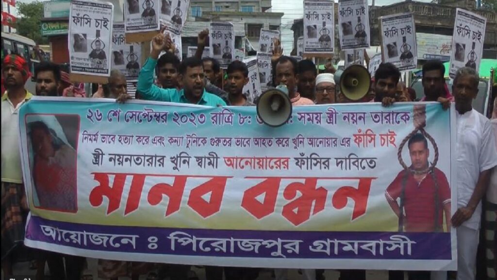 চুয়াডাঙ্গা পৌর এলাকার সুমিরদিয়া গ্রামের গৃহবধু সাদিয়া সুলতানা নয়নতারাকে (৩৫) কুপিয়ে হত্যার ঘটনায় পলাতক স্বামী আনোয়ার হোসেনের গ্রেফতার ও ফাঁসির দাবিতে বিক্ষোভ ও মানববন্ধন করা হয়েছে।