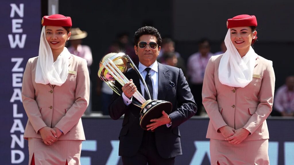 ২০২৩ সালের বিশ্বকাপের ‘গ্লোবাল অ্যাম্বাসাডর’ ঘোষণা করেছে আন্তর্জাতিক ক্রিকেট কাউন্সিল। আহমেদাবাদের নরেন্দ্র মোদি স্টেডিয়ামে বিশ্বকাপ ট্রফি হাতে মাঠে ঢুকলেন শচীন। সেই ট্রফি নিয়ে রাখলেন পোডিয়ামে। তার সামনে তখন দাঁড়িয়ে একসময়ের সতীর্থ জাভাগল শ্রীনাথ। তিনি এখন আইসিসি-র ম্যাচ রেফারির দায়িত্বে আছেন।