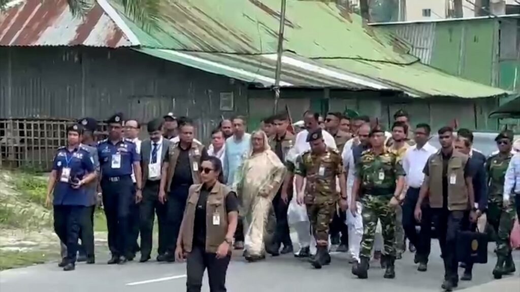 নিজ বাড়ি থেকে প্রায় ১ কিলোমিটার পায়ে হেঁটে টুঙ্গিপাড়া উপজেলা আওয়ামী লীগ কার্যালয়ে গেছেন আওয়ামী লীগ সভাপতি ও প্রধানমন্ত্রী শেখ হাসিনা।