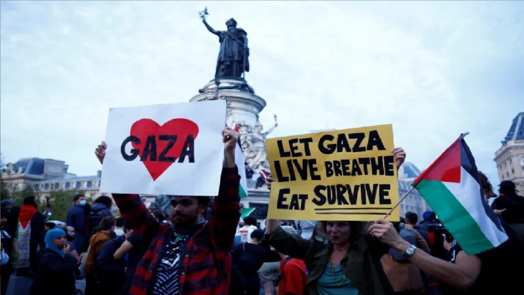 রাজপথ অবরোধ করে ক্ষোভ প্রকাশ করেন বিক্ষোভকারীরা। ইসয়ায়েলি দখলদারদকে খুনি এবং প্রেসিডেন্ট ম্যাকরনকে দুষ্কর্মের সহযোগী বলে স্লোগান দিতে থাকেন তারা। একপর্যায়ে বিক্ষোভকারীদের ছত্রভঙ্গ করতে টিয়ার গ্যাস ও জলকামান নিক্ষেপ করে পুলিশ।
