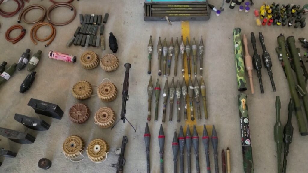 এর মধ্যে গ্রেনেড, রকেট লঞ্চার, ল্যান্ডমাইনের মতো ভারী যুদ্ধাস্ত্র রয়েছে। তবে কোথা থেকে সেগুলো উদ্ধার হয়েছে তা নিশ্চিত করেনি ইসরায়েলি সেনারা।