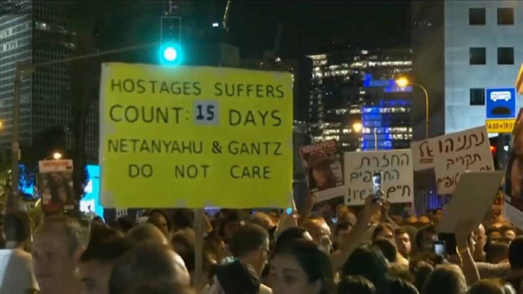 এ সময় ইসরায়েলি প্রতিরক্ষা মন্ত্রণালয় ঘেরাও করেন বিক্ষোভকারীরা। তাদের হাতে যুদ্ধবিরতি এবং জিম্মিমুক্তির প্ল্যাকার্ড শোভা পাচ্ছিলো।
