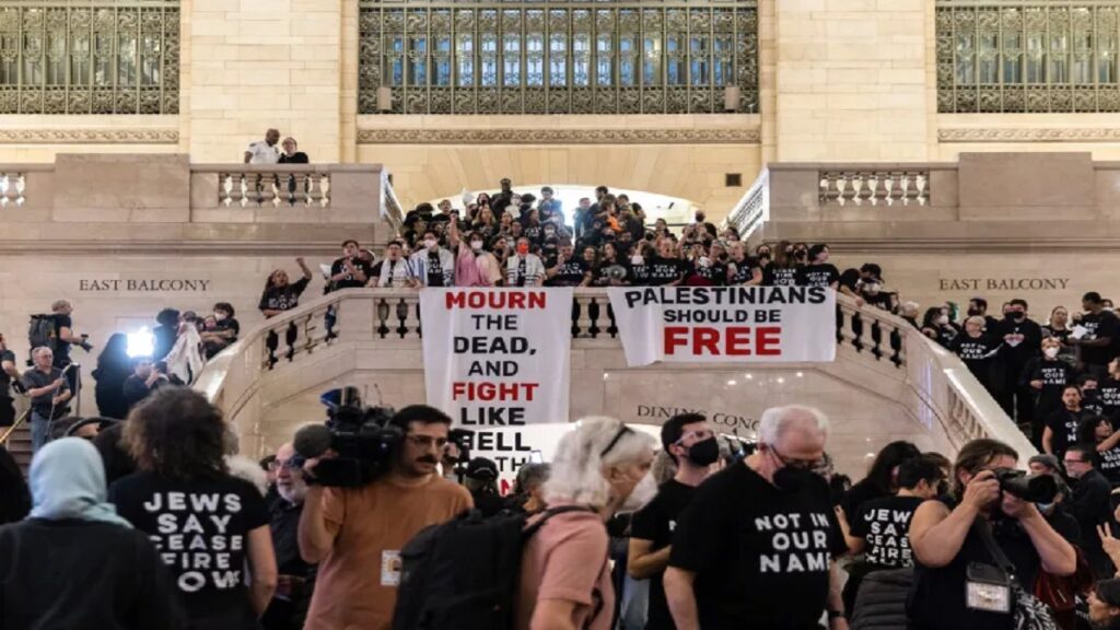 গ্রান্ড সেন্ট্রাল টার্মিনাল হলো নিউইয়র্কের একটি অতি গুরুত্বপূর্ণ ট্রান্সপোর্ট হাব। এ দিন ফিলিস্তিনিদের সমর্থনে জিউইস ভয়েস ফর পিস নামের একটি ইহুদি সংগঠনের উদ্যোগে সমবেত হন কয়েক’শ মানুষ। এই কর্মসূচিতে অংশগ্রহণকারীরা প্রত্যেকেই কালো রঙের টি-শার্ট পরেন, সেই টি-শার্টে লেখা ছিল তাদের বিভিন্ন দাবি। ‘ক্যাসফায়ার নাও’, ‘নট ইন আওয়ার নেম’ সহ বিভিন্ন লেখা লক্ষ্য করা যায় তাদের টি-শার্টে। সেই সাথে ফিলিস্তিনের স্বাধীনতার দাবি, গাজায় ইসরায়েলের বোমাহামলা বন্ধ ও যুদ্ধবিরতিসহ বিভিন্ন স্লোগানও দেন তারা।