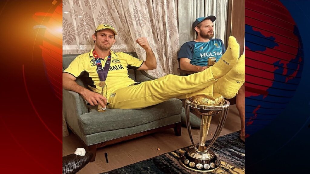 সোমবার (১৯ নভেম্বর) বিশ্বকাপ জেতার পরে দলের উদযাপনের বেশ কয়েকটি ছবি নিজের ইনস্টাগ্রাম স্টোরিতে দেন অজি অধিনায়ক প্যাট কামিন্স। সেখানেই একটি ছবিতে দেখা যায়, মিচেল মার্শ হেলান দিয়ে বসে আছেন চেয়ারে। দুই পা ট্রফির ওপর তুলে হাসি মুখে আয়েশি উদযাপন করছেন অস্ট্রেলিয়া দলের এই অলরাউন্ডার। এক হাতে পানীয়ের বোতল, অন্য হাত মুষ্টিবদ্ধ। এই ছবি নিয়ে সোশ্যাল মিডিয়ায় উঠেছে সমালোচনার ঝড়। নেতিবাচক প্রতিক্রিয়া দেখিয়েছেন নেটিজেনরা।