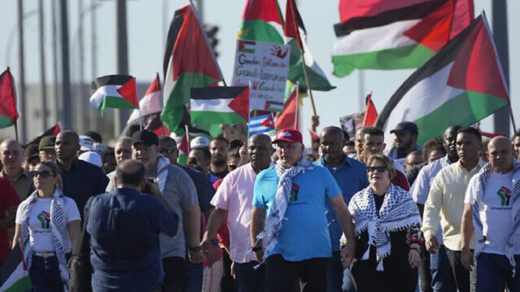 এসময় গাজায় ‘গণহত্যা’ বন্ধের দাবি তোলেন হাজার হাজার কিউবান নাগরিক। ফিলিস্তিনের পতাকা, প্ল্যাকার্ড নিয়ে এতে অংশ নেন বিক্ষোভকারীরা। ইসরায়েলকে গণহত্যাকারী আখ্যা দেয়া হয়। দাবি উঠে, স্বাধীন ফিলিস্তিন রাষ্ট্র গঠনের।